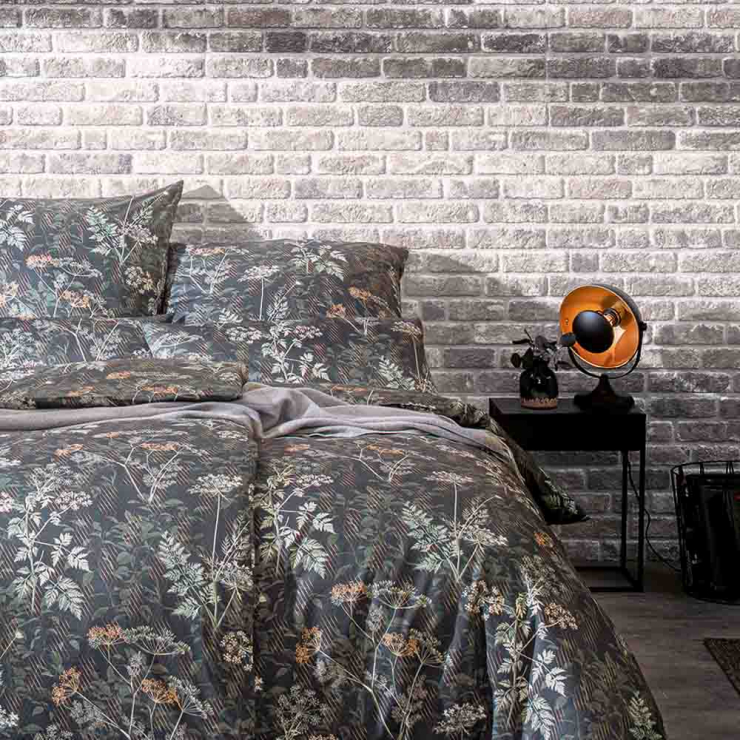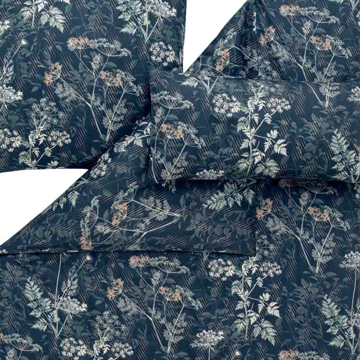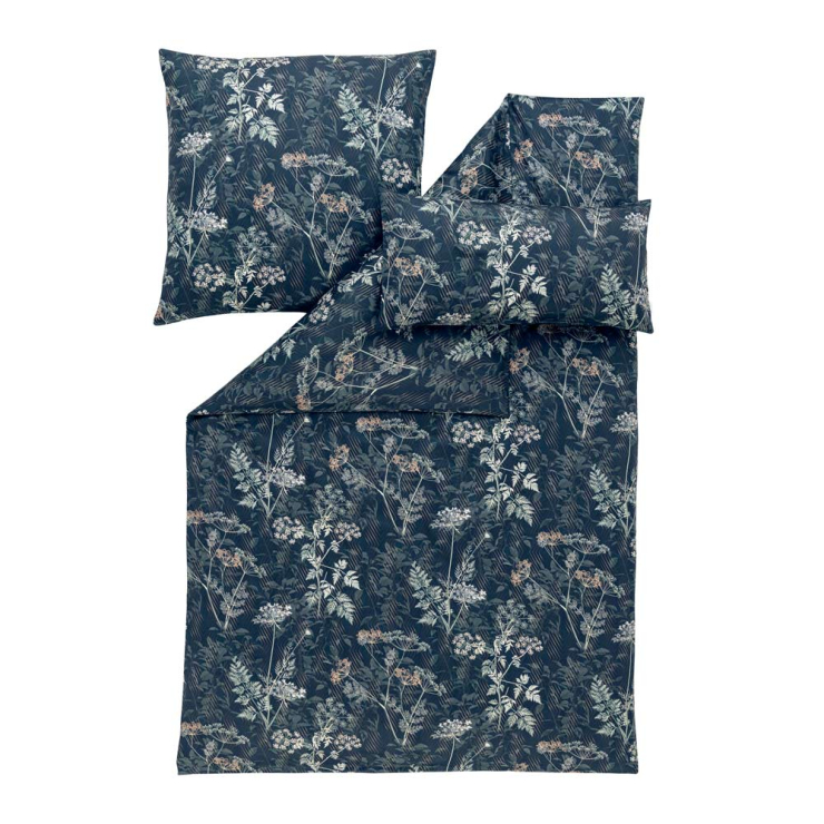 Achillea ist ein nachtblauer Bettwäscheträum mit besonderer Wald- und Wiesenromantik. Das Set, bestehend aus kuschelweisen Kissen- und Bettdeckenbezügen, lässt unzählige Gräser und Sträucher in den heimischen vier Wänden erblühen. Doch von kitschiger Blütenpracht ist hier nichts zu sehen. Denn aufgrund seiner gleichermaßen stilvollen wie dezenten Farbgebung wirkt das Design trotz allem angenehm zurückhaltend und bleibt so maximal kompatibel.