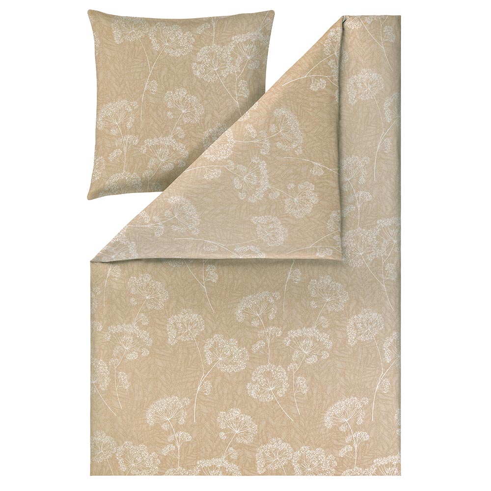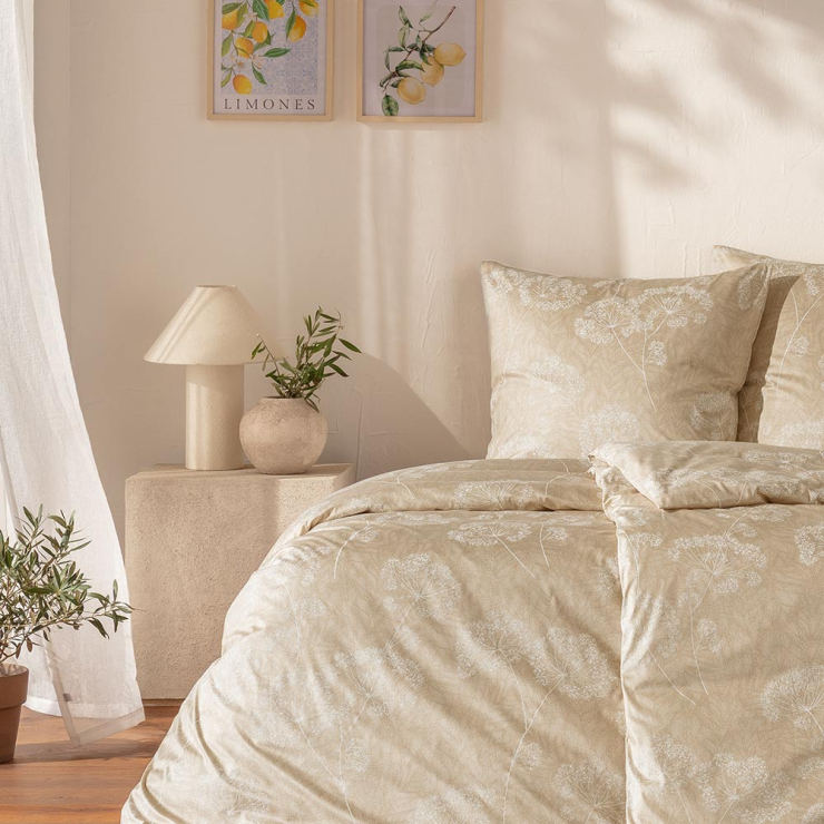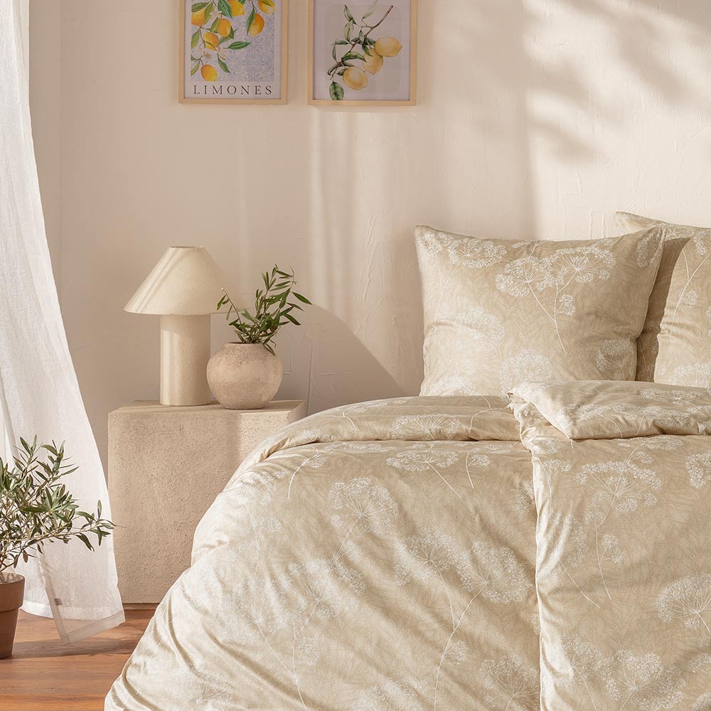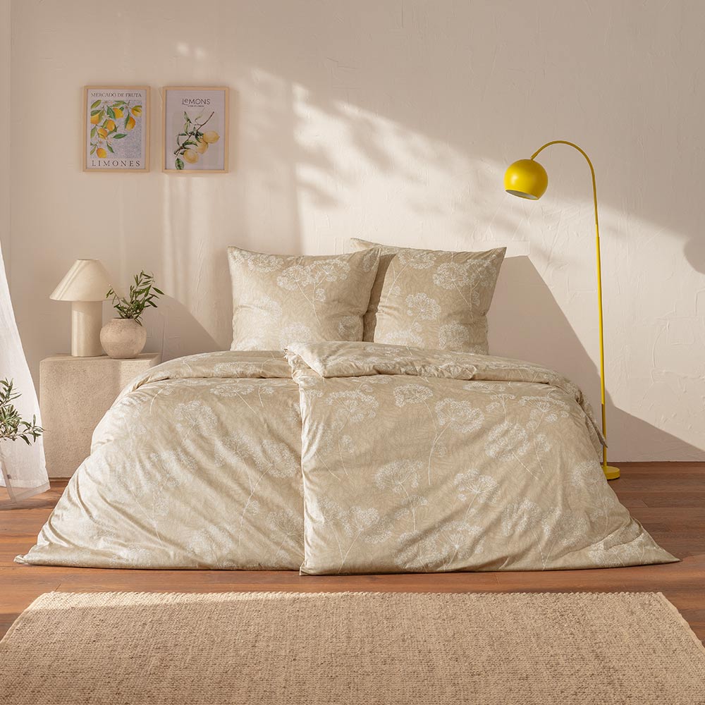 Bettwäsche Anja in der Farbe Sand verbindet zeitlose Natürlichkeit mit ruhiger Eleganz. Das feine florale Dessin wirkt dezent und harmonisch und verleiht dem Schlafzimmer eine warme, wohnliche Atmosphäre. Die sanfte Farbgebung in Sand lässt sich vielseitig kombinieren und passt sowohl zu modernen als auch zu klassischen Einrichtungsstilen.