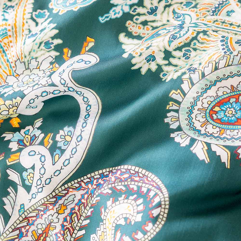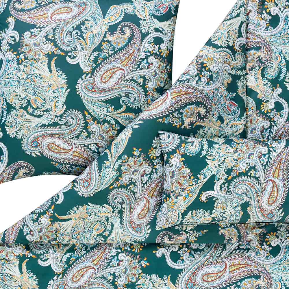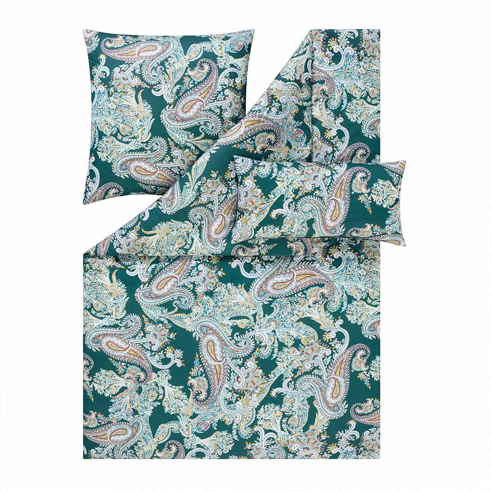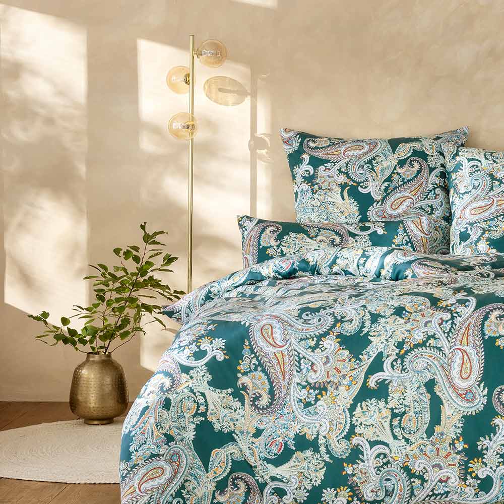 Die Bettwäsche Annette in der Farbe Smaragd vereint luxuriöse Eleganz mit einer warmen, modernen Ausstrahlung. Der tief smaragdgrüne Hintergrund bildet die perfekte Bühne für das kunstvoll ausgearbeitete Paisley-Muster in feinen Creme-, Rosé- und Jadeakzenten. Die Bettwäsche Annette in der Farbe Smaragd wird sofort zum Blickfang und verleiht deinem Schlafzimmer eine exklusive, stilvolle Note.