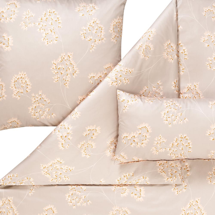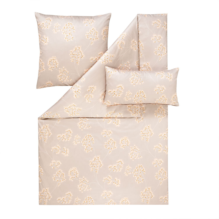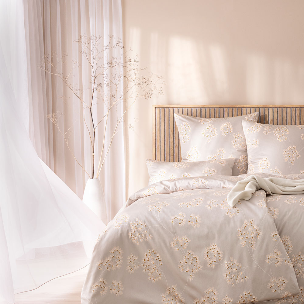 Die Schweizer Premium-Satin-Bettwäsche Antje in der Farbe Puder verleiht deinem Schlafzimmer eine Aura von Ruhe und Leichtigkeit. Zarte Blüten in Creme- und Pudertönen entfalten auf dem edlen, seidig schimmernden Satin ihre elegante Wirkung – ein Design, das zeitlos schön und zugleich wohltuend modern wirkt.