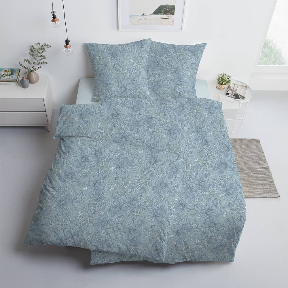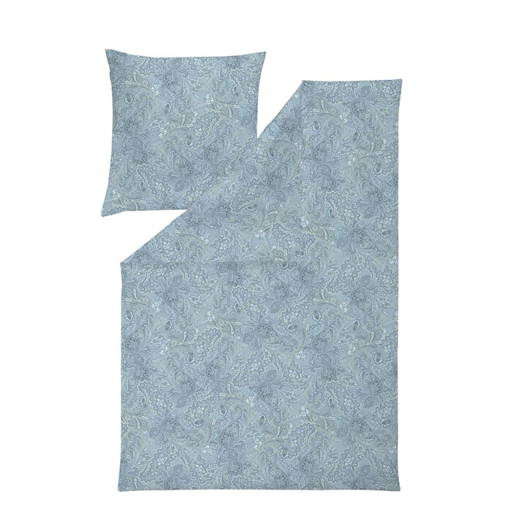 Bettwäsche „Aris“ in der Farbe Eisblau bringt mit ihrem feinen Paisley-Muster in Eisblau, Salbei und zarten Naturtönen stilvolle Eleganz in dein Schlafzimmer. Die harmonische Farbgebung wirkt frisch und beruhigend zugleich – perfekt für ein wohnliches Ambiente mit besonderem Charakter.