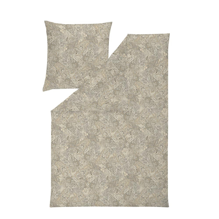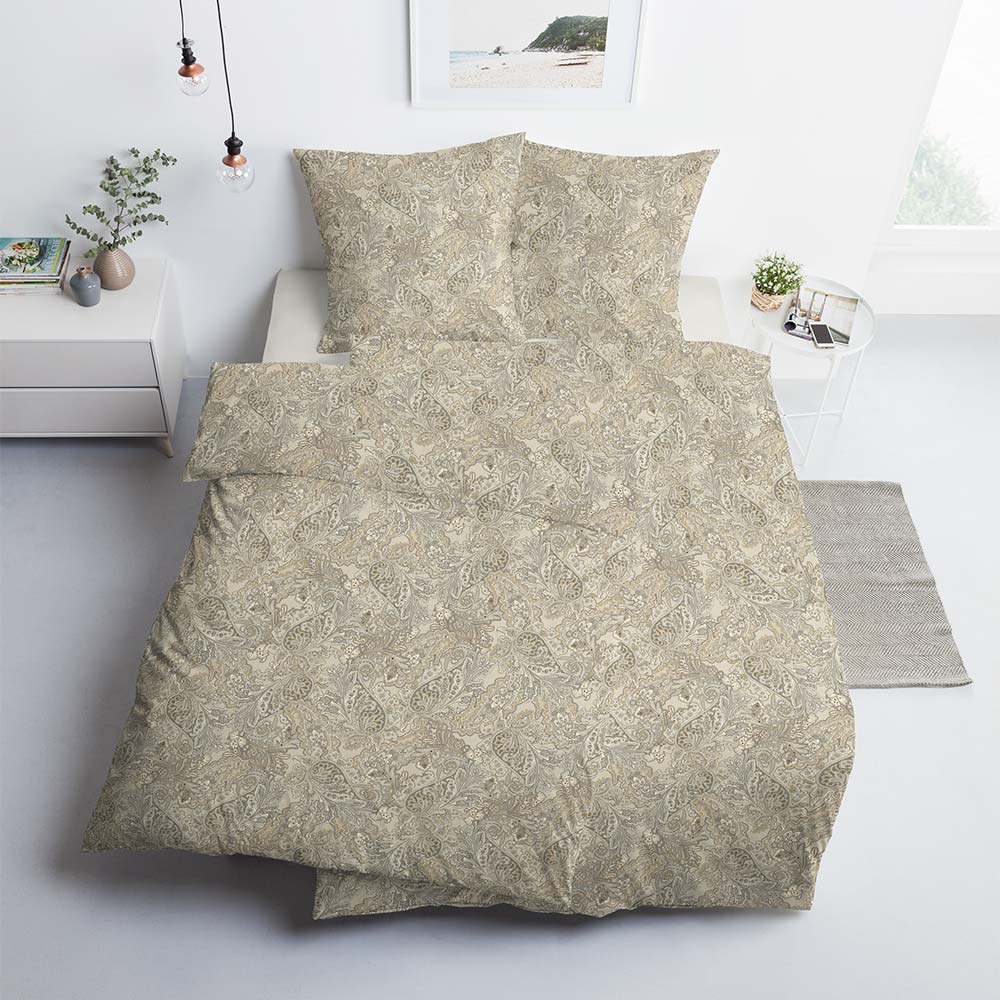 Bettwäsche „Aris“ in der Farbe Sand verbindet klassische Eleganz mit natürlicher Zurückhaltung. Das detailreiche Paisley-Muster in warmen Sand- und Beigetönen wirkt edel und harmonisch – ideal für ein stilvoll eingerichtetes Schlafzimmer mit ruhiger Ausstrahlung.