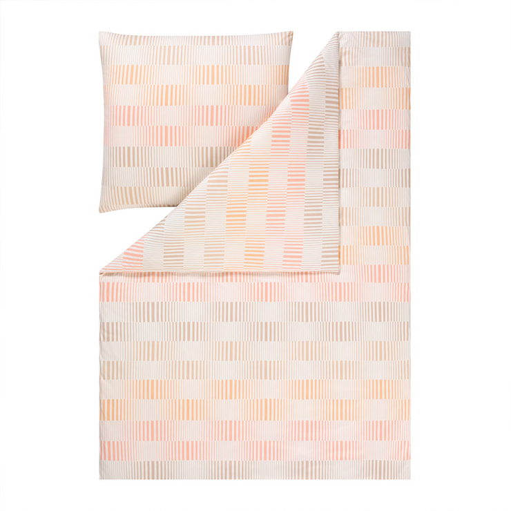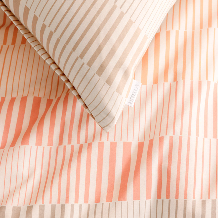 Ihr grafisches Streifenmuster in sanften Apricot-, Beige- und Rosétönen schafft eine stilvolle Balance zwischen Leichtigkeit und Behaglichkeit.