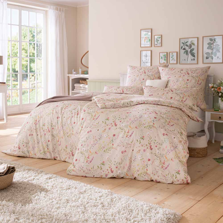 Zuckersüß und blumig schön präsentieren sich die Bezüge der Dilara Bettwäschegarnitur. Das Set zeigt ein filigranes Blumenmuster, das sich über die komplette Fläche der Kopfkissen- und Bettdeckenbezüge erstreckt. Stell dir vor, wie diese Garnitur auf einem schlichten weißen Bettgestell zur Geltung kommt, ergänze sie mit Kissen in Rosa und Pink oder setze mit einer Tagesdecke in Blau einen eleganten Kontrast. Du entscheidest.
