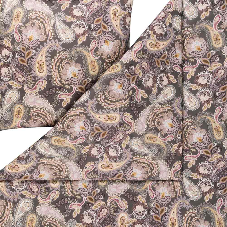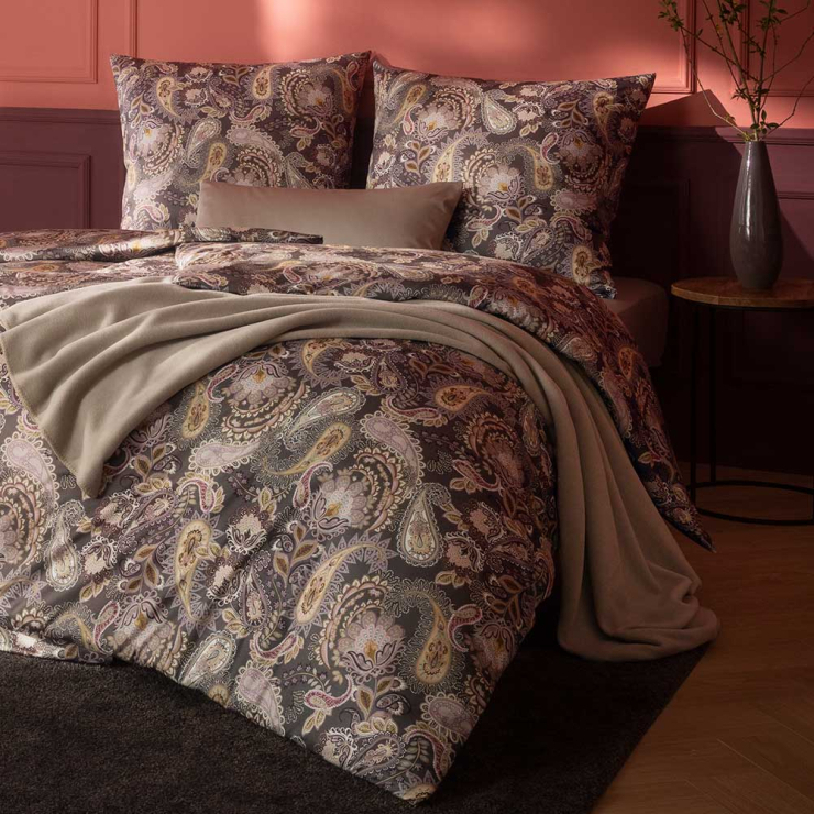 Bettwäsche Elisabeth in der Farbe Aubergine ist ein Statement klassischer Eleganz. Das kunstvoll gestaltete Paisley-Muster in edlen Tönen von Aubergine, Flieder, Goldbeige und Natur auf dunklem Fond verleiht deinem Schlafzimmer eine luxuriöse, warme Atmosphäre.