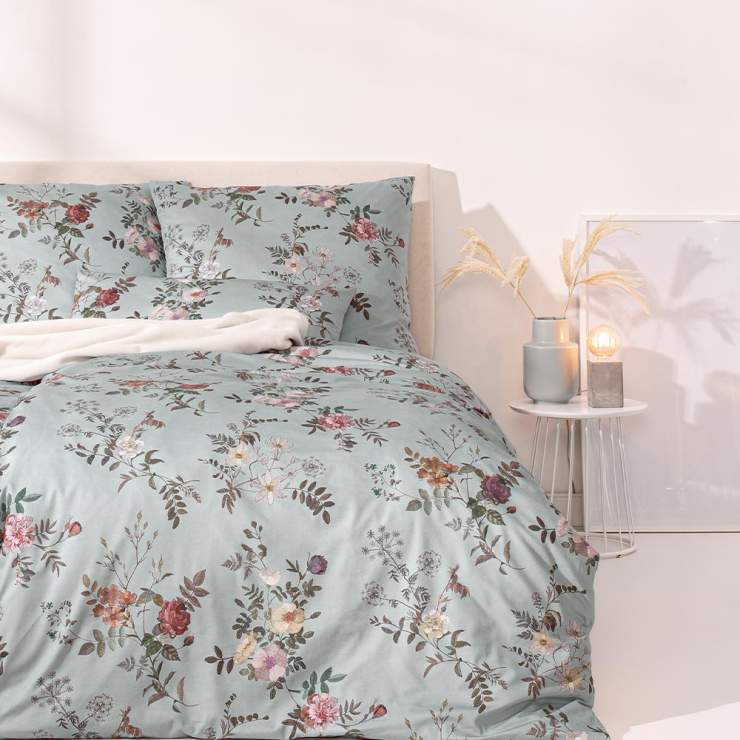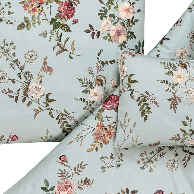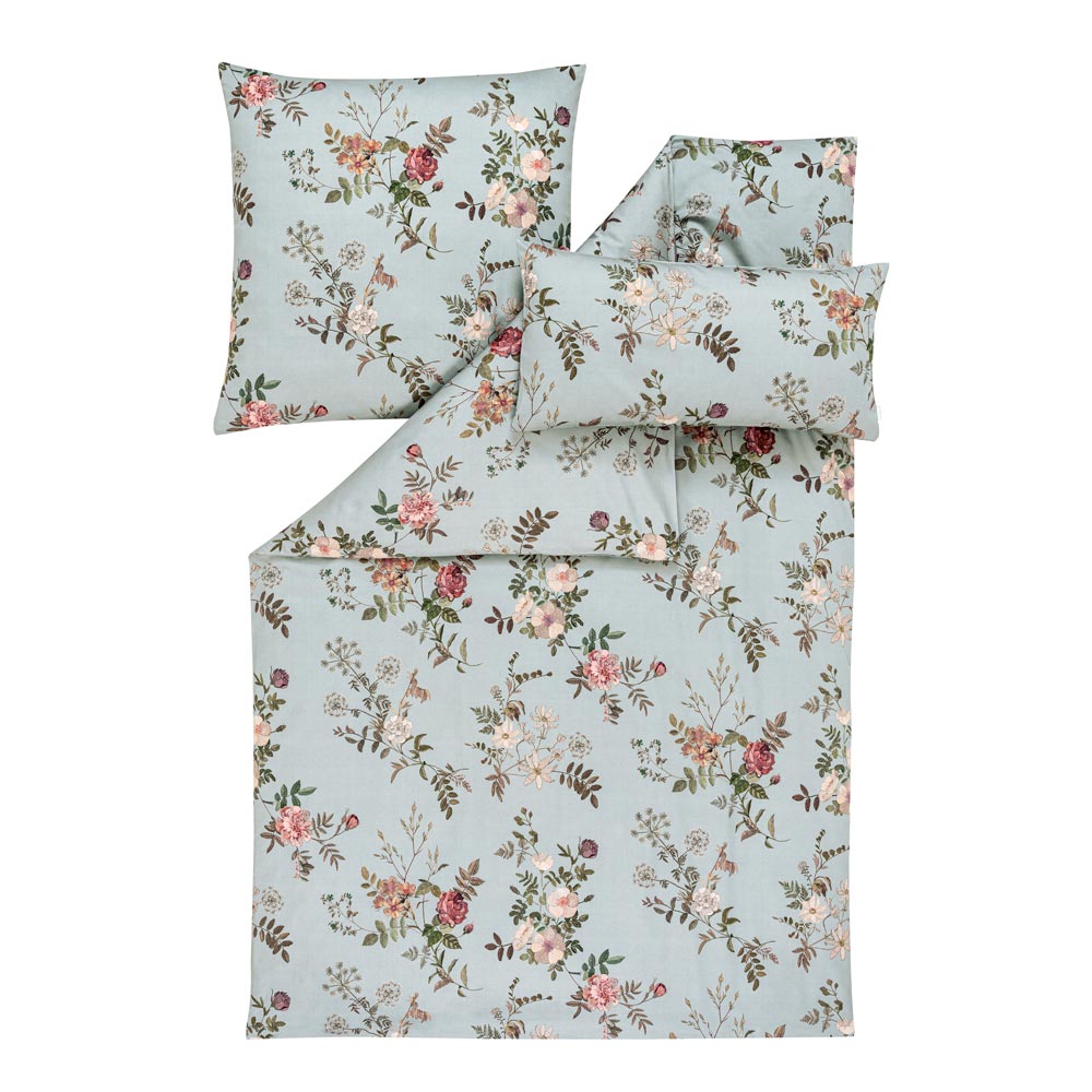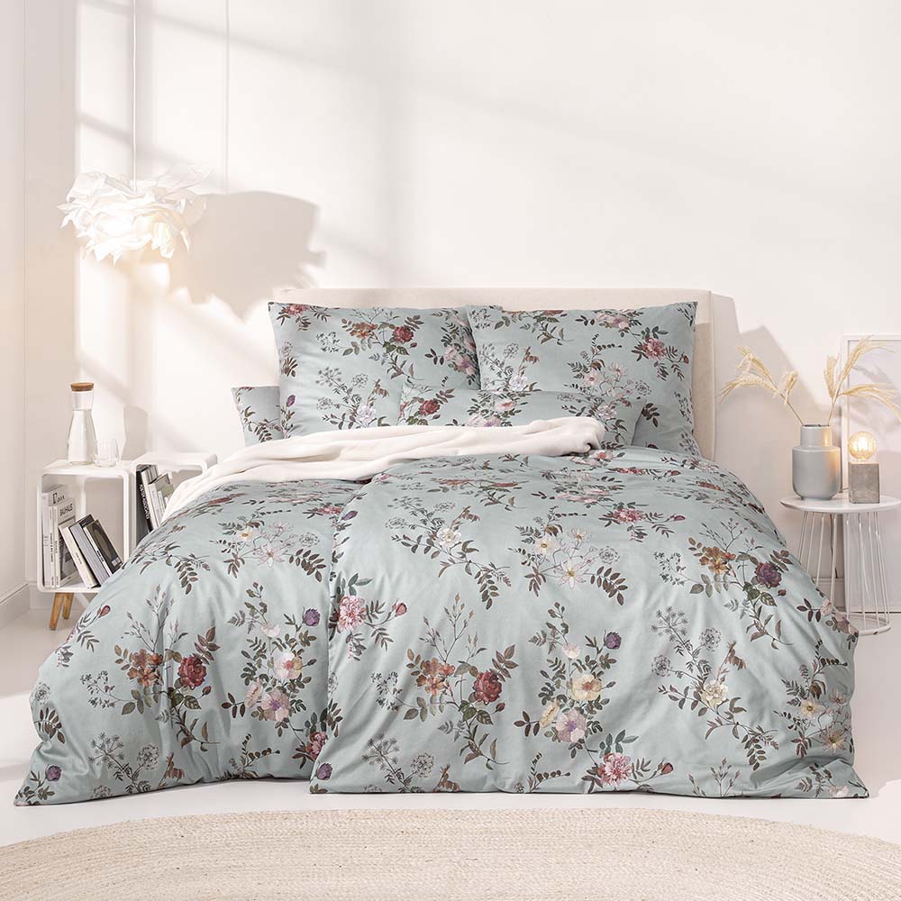 Die Bettwäsche Estefania ist ein zeitloses Highlight für deine Schlaf- und Gästezimmer: Der helle und freundliche Basisfarbton Salbei bildet eine ausgezeichnete Grundlage für den floralen Aufdruck. Rote Rosen, violette Wildblumen, cremefarbene Blüten und feine Blätter erschaffen ein Gesamtbild allererster Güte. Dennoch bleibt auf dem Stoff noch genug optischer Freiraum, um Estefania nach Lust und Laune zu dekorieren.