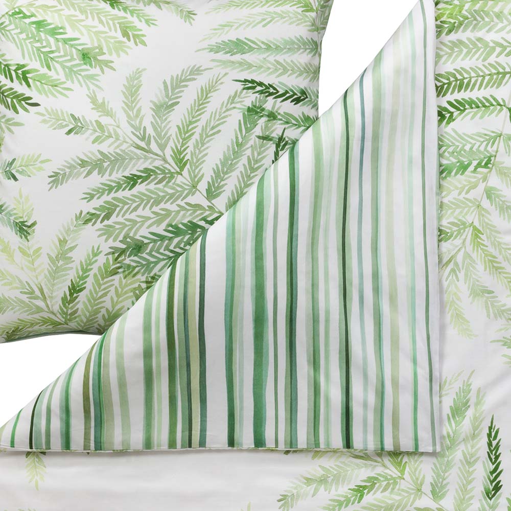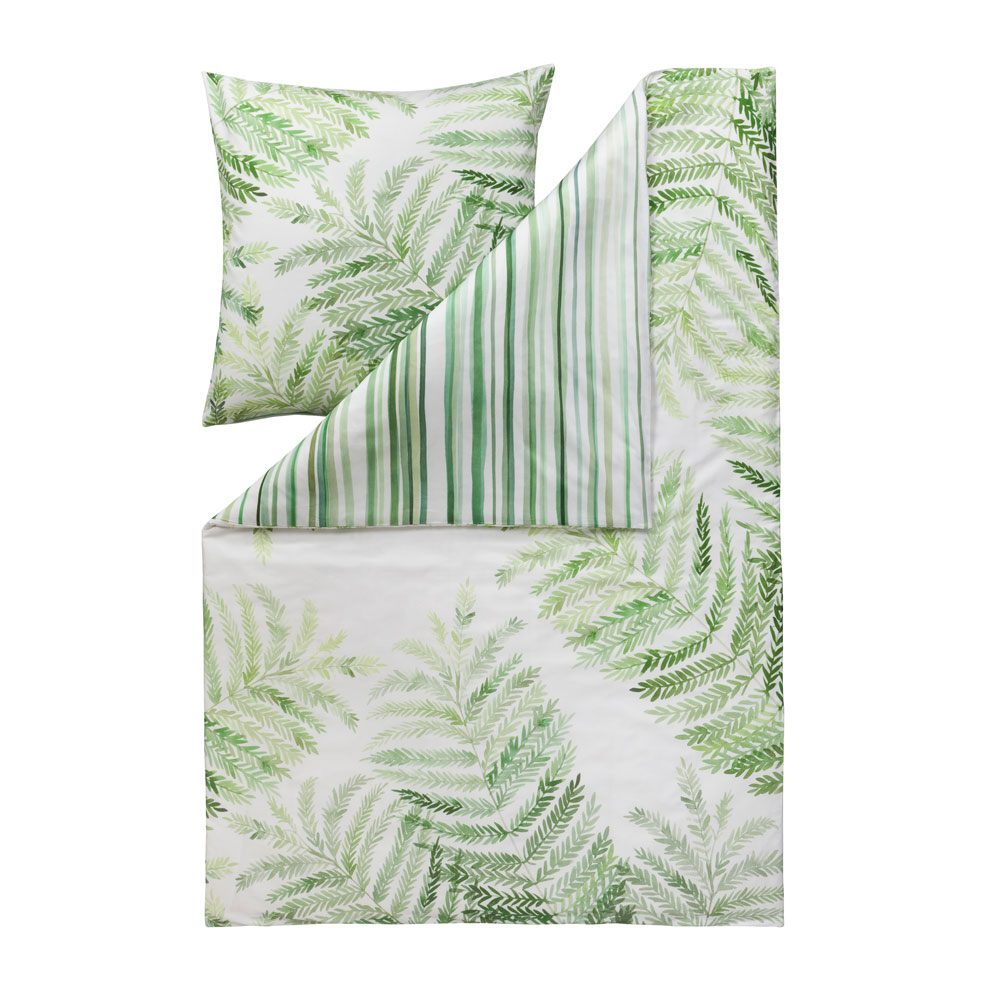 In üppigem Dickicht ist unsere Bettwäsche Fern zu Hause. Denn über dem hell eingefärbten Stoff scheint sich ein grünes Blätterdach, wie in dichten Urwäldern, zu schließen. Es grünt Ihnen zu grün im Schlafzimmer? Kein Problem! Mit den Kopfkissen- und Bettdeckenbezügen in Wendeoptik kommt mit nur einem Dreh ein 2. Muster im klassischen Streifenlook zum Vorschein. Testen Sie es selbst!