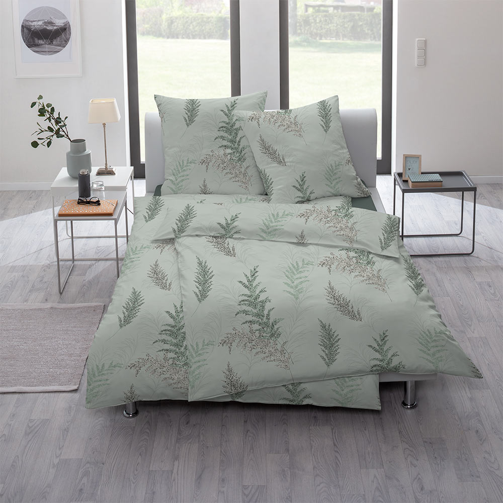 Bettwäsche „Fiamma“ in der Farbe Salbei bringt mit ihrem detailreichen Farnmotiv in natürlichen Grüntönen und zarten Beigenuancen ein elegantes, botanisches Flair in dein Schlafzimmer. Das beruhigende Salbeigrün im Hintergrund wirkt modern und ausgleichend – ideal für alle, die sich nach Entschleunigung und Naturverbundenheit sehnen.