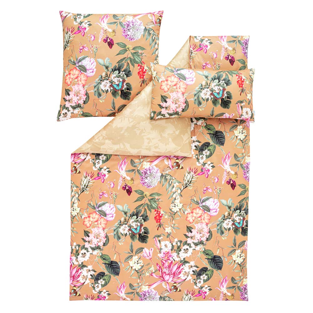 Für die Mako-Satin-Bettwäsche Fiore empfehlen wir die Spannbetttuchfarbe 200-beige oder 065-mauve.