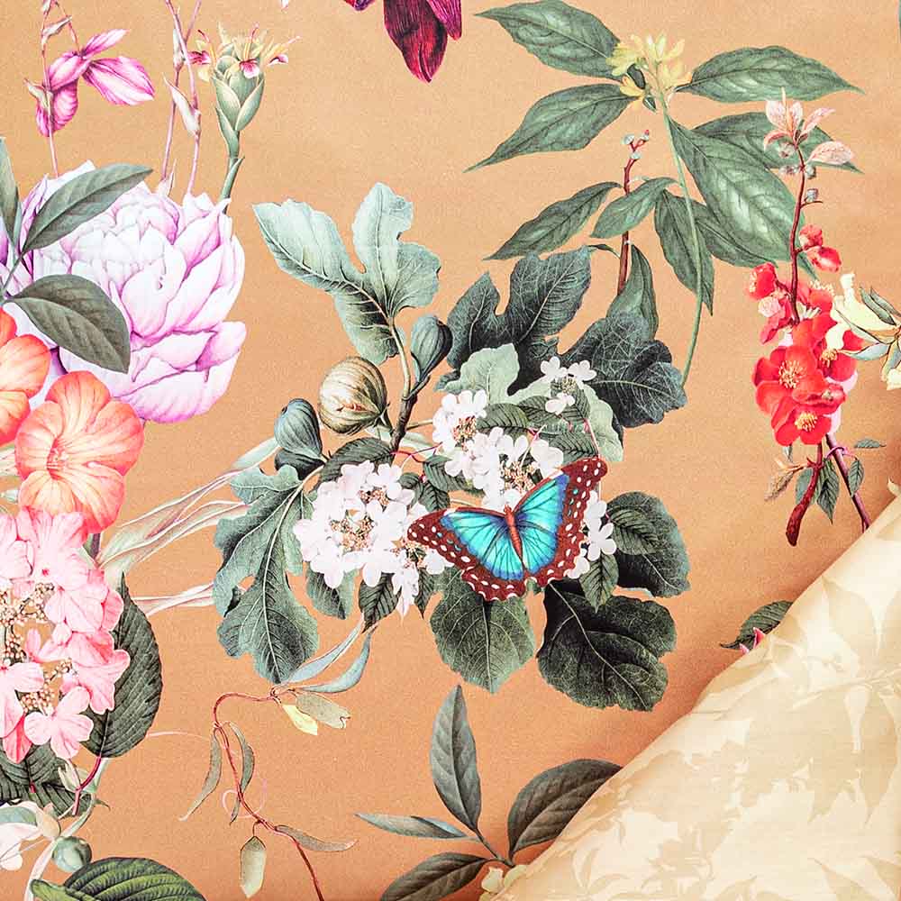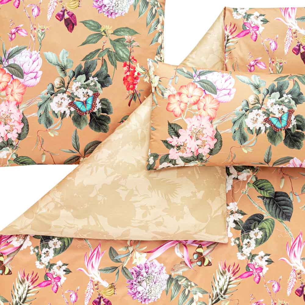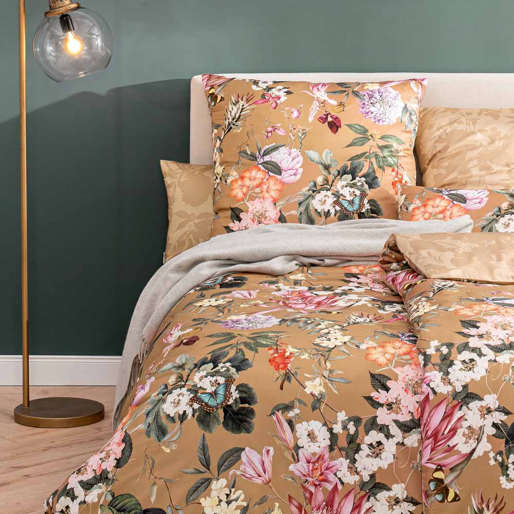 Mit ihren zahllosen Blüten, Blättern und Schmetterlingen ist die Bettwäsche Fiore ein echter Blickfang in deinen heimischen vier Wänden. Komplettiert wird das Muster durch eine besondere Grundfarbe, genannt Messing. Sie verleiht den Kissen- und Bettdeckenbezügen einen goldenen Schimmer. Und wenn du diesen Effekt noch verstärken willst, drehe die Bettwäsche mit Wendeoptik einfach auf die Rückseite und genieße das weich schattierte Ton-in-Ton-Design.