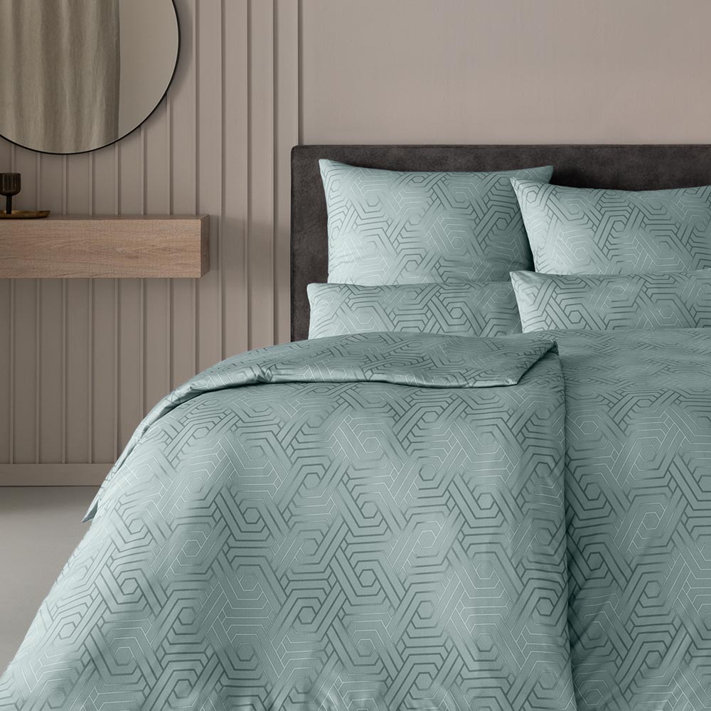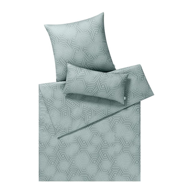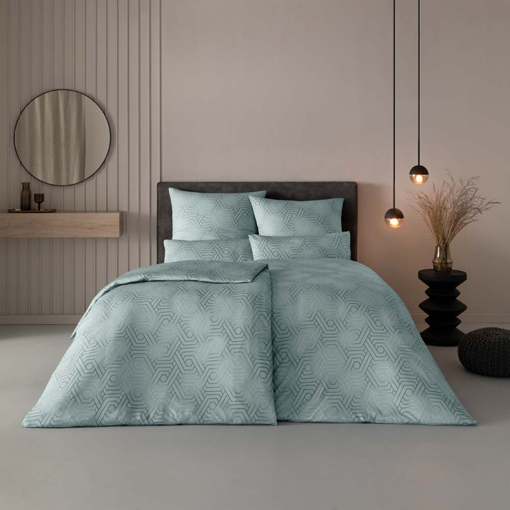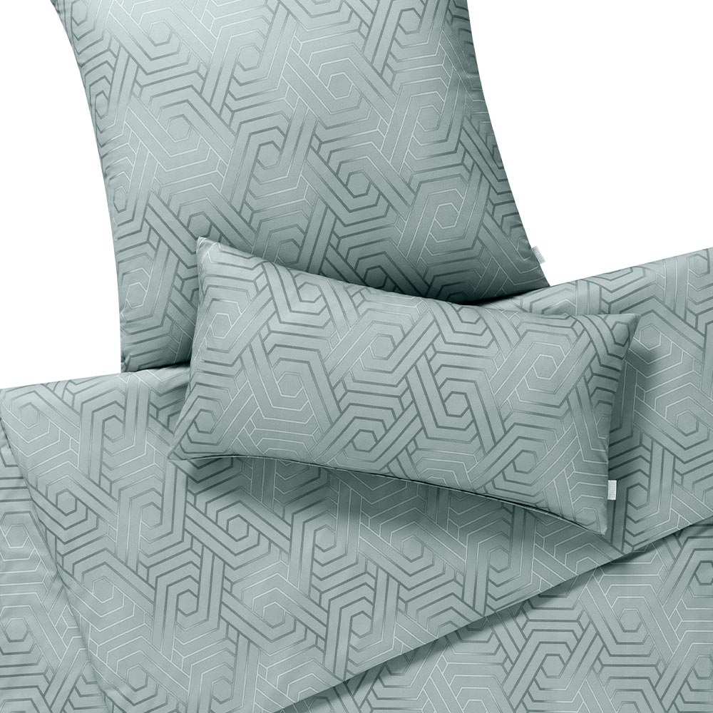 Auf den Bezügen der Garnitur Frederik sorgt ein zeitloses, geometrisches Design für frischen Wind. Der elegante Farbton Taube bildet die Basis für ein komplexes Muster aus ineinander verschlungenen Linien und Formen, die eine subtile, aber beeindruckende Struktur schaffen. Die hellen Akzente innerhalb des Musters fangen das Licht ein und verleihen der Bettwäsche eine leicht schimmernde Note.