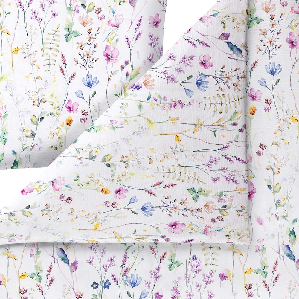 Filigrane Wildblumen in sanften Aquarellfarben – von zartem Lila über sonniges Gelb bis hin zu frischem Grün – verteilen sich harmonisch über den hellen Hintergrund und bringen eine natürliche, fröhliche Atmosphäre in dein Schlafzimmer.