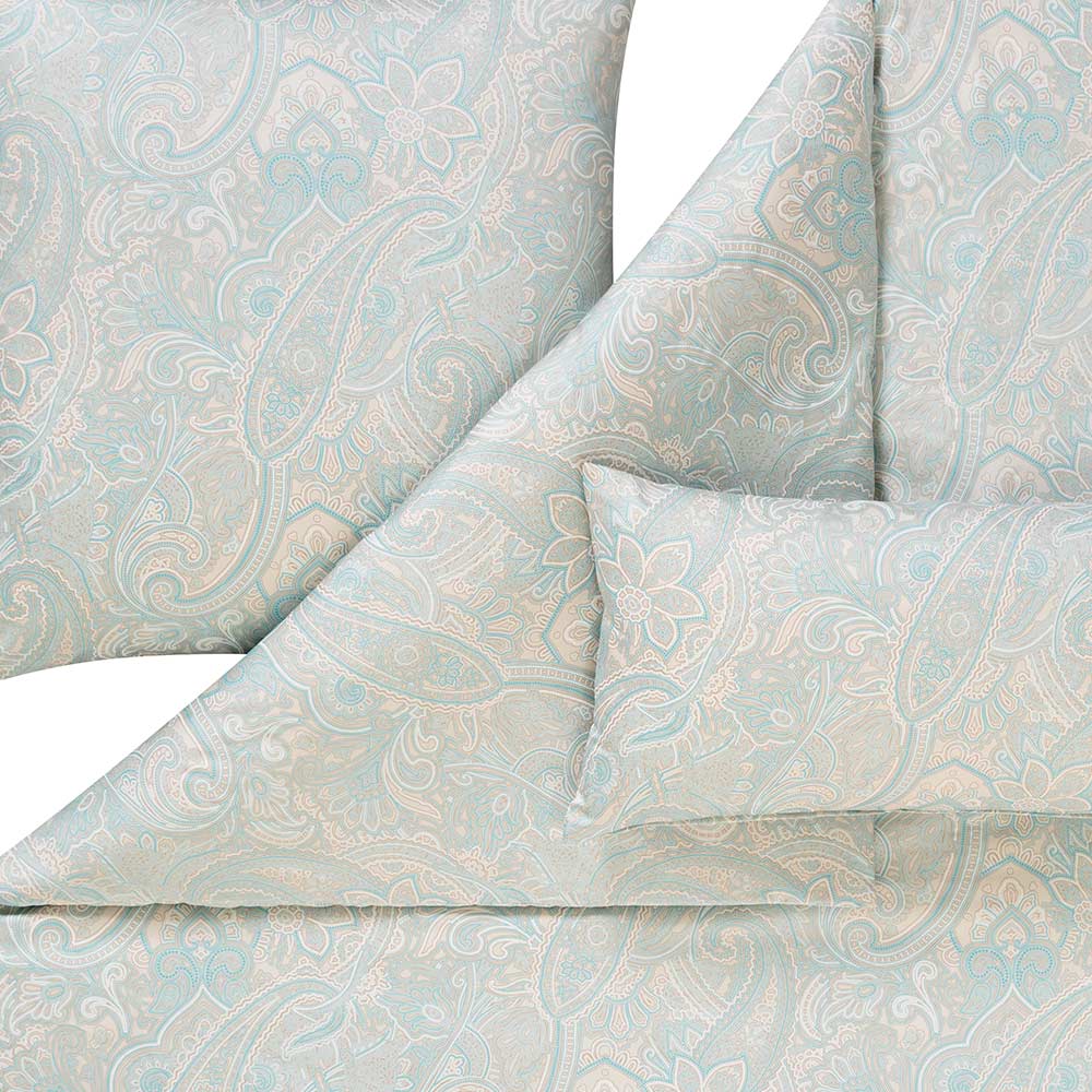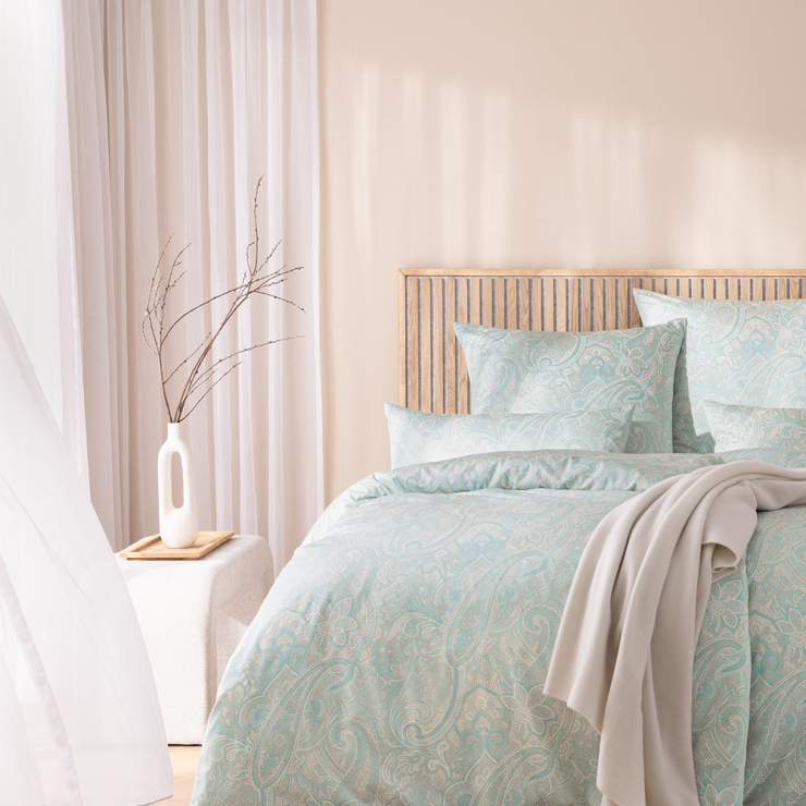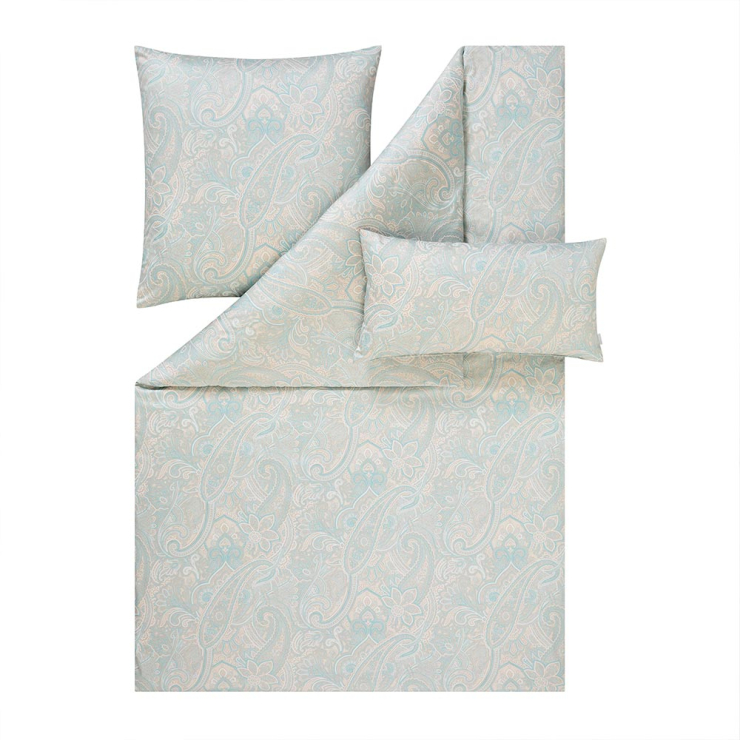 Die Mako-Satin-Bettwäsche Judith in der Farbe Elfenbein vereint moderne Eleganz mit einem Hauch klassischer Leichtigkeit. Ihr fein geschwungenes Paisley-Muster in sanftem Elfenbein und zartem Mint verleiht jedem Schlafzimmer eine ruhige, harmonische Atmosphäre – ideal für alle, die Wert auf stilvolles Understatement und höchsten Schlafkomfort legen.