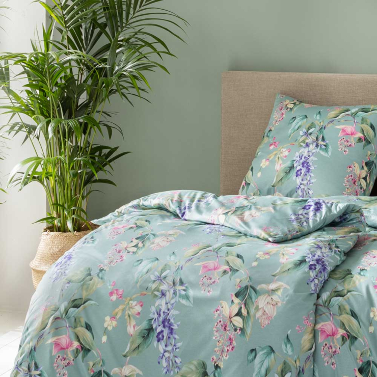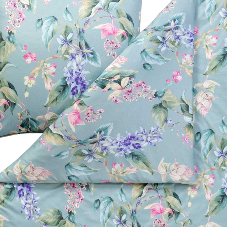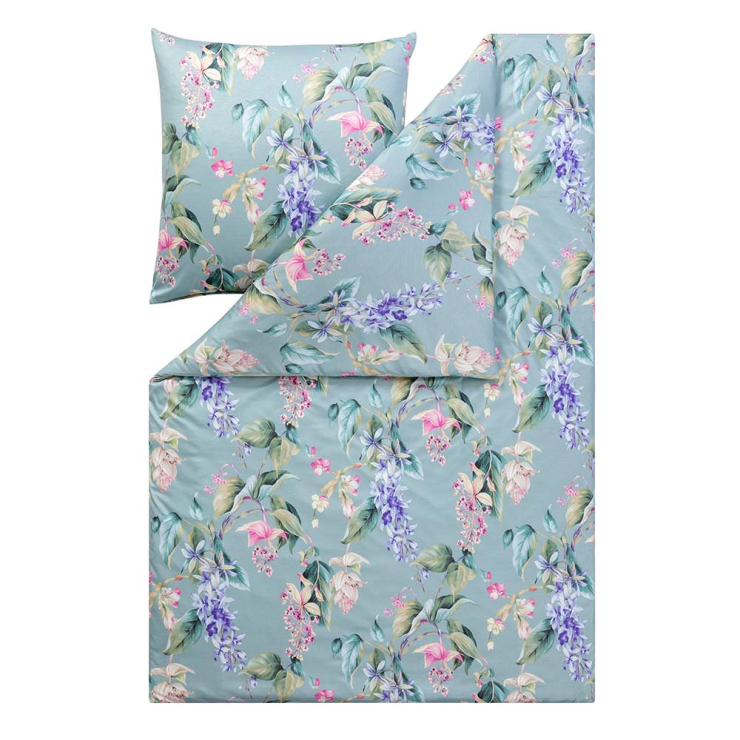 Beinahe ein Muss für Liebhaber botanischer Gärten: Auf den Kissen- und Bettdeckenbezügen der Garnitur Kalea ist ein buntes Bouquet der schönsten Blumen in Violett, Rosa und Creme zu Hause. Dazu gesellt sich prächtiges Blattwerk in satten Grüntönen. Gebettet wird das florale Design auf einen mint-farbenen Untergrund. Das Ergebnis ist eine Optik, die es noch schöner nur in freier Natur zu bewundern gibt.