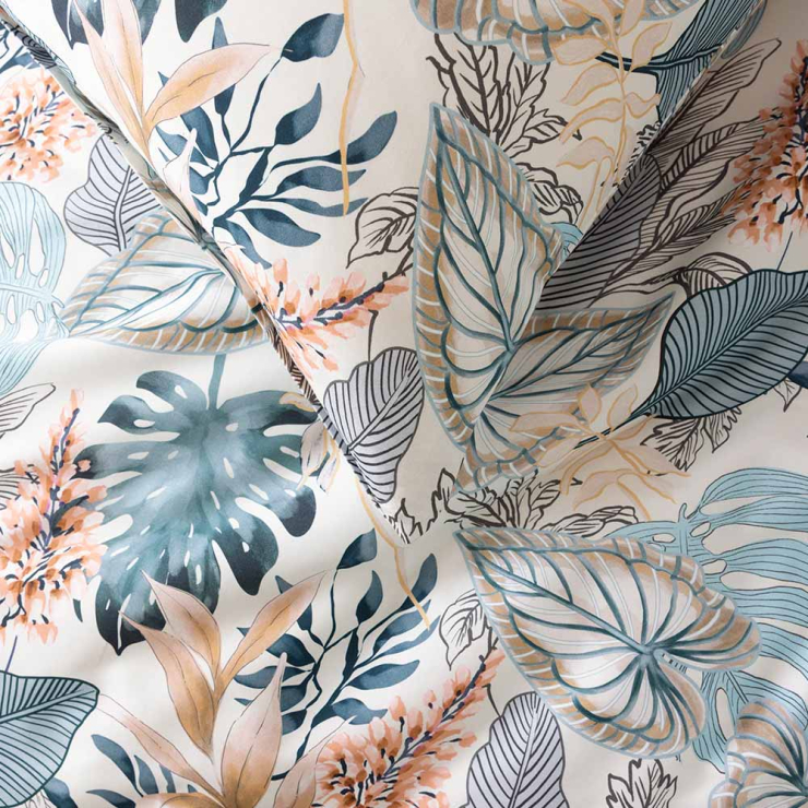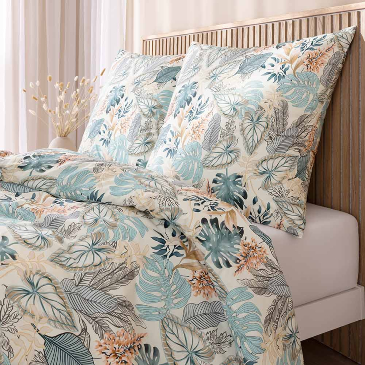 Die Mako-Satin-Bettwäsche Liane in der Farbe Azur bringt eine frische, natürliche Ruhe in dein Schlafzimmer. Großzügige, aquarellierte Blätter in Azur, Salbei und warmen Sandtönen entfalten ein harmonisches Farbspiel – modern, lässig und wunderbar kombinierbar mit Holz, Leinen und klaren Formen.