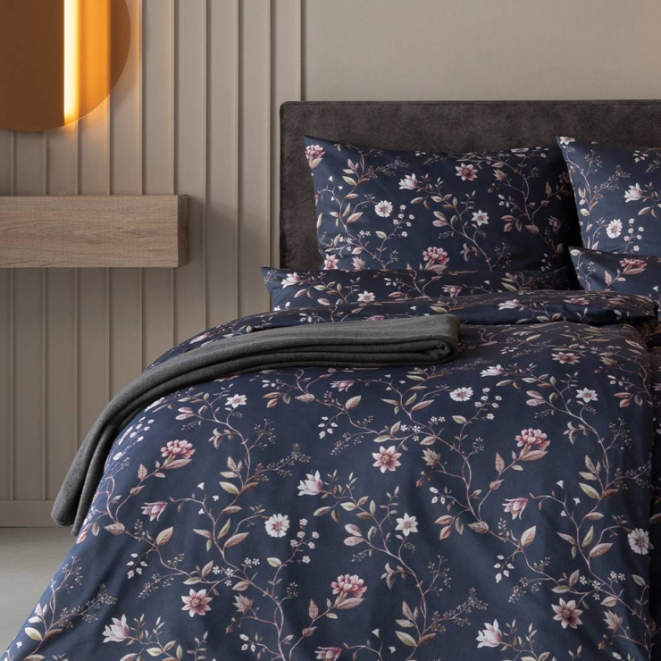 Sorge in deinem Schlafraum mit dem Bettwäscheset Linda für eine luxuriöse und zugleich beruhigende Stimmung. Das Design in tiefem Indigoblau zeigt filigrane Blüten und Zweige in Rosatönen und Weiß, die wie kleine Kunstwerke auf dem dunklen Hintergrund wirken. Um die intensiven Farben optimal in Szene zu setzen, kombiniere den Stoff mit gradlinigem Interieur, metallisch glänzenden Dekorationen und indirekten Lichtquellen.