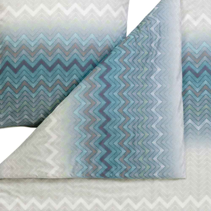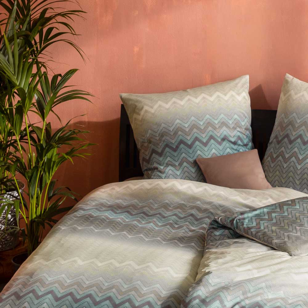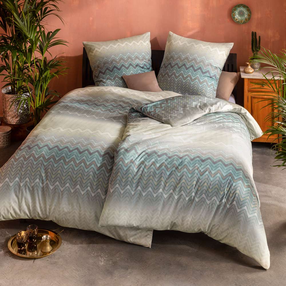 Es besteht kein Zweifel. Die Bezüge der Bettwäsche Luna sind auf Zack. Genauer gesagt: Zickzack. Denn das schmale Zickzack-Muster im grünen Grundfarbton steht im Zentrum dieser kombinationsfreudigen Garnitur. Die einzelnen Linien reihen sich mal etwas heller, mal etwas dunkler in die Musterung ein. Gleichzeitig greifen sie viele vorhandene Umgebungsfarben auf. So entsteht eine agile Optik, die jedem Schlafraum den letzten Schliff verleiht.