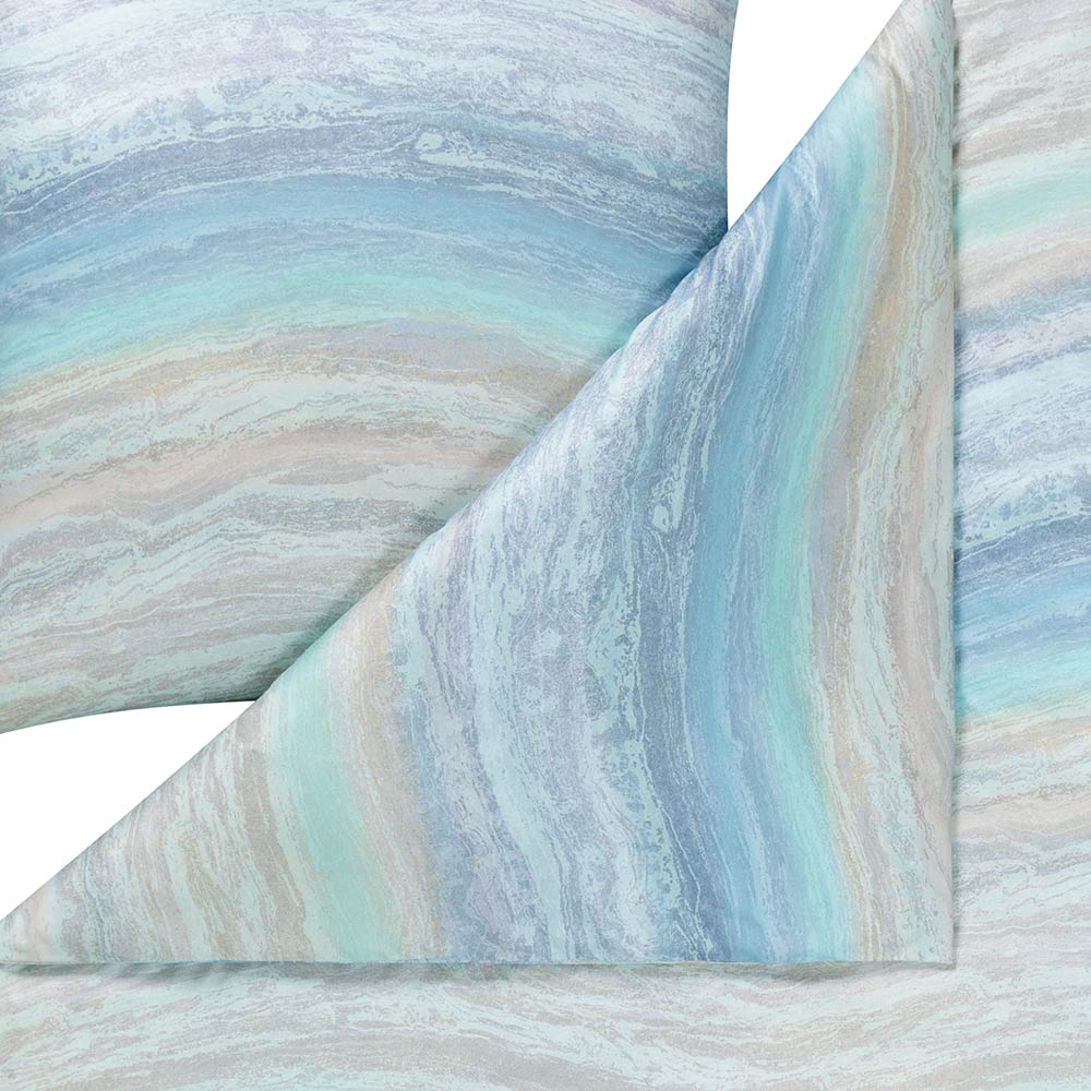 Ihr fließendes Wellen-Design in zarten Blau-, Türkis- und Sandnuancen erinnert an Meeresrauschen und sanftes Strandlicht – ideal, um dein Schlafzimmer in eine Oase der Entspannung zu verwandeln.