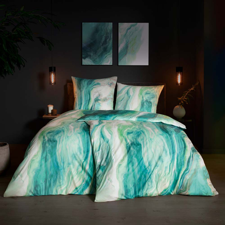 Diese Bettbezüge namens Marbling kommen mit einem faszinierenden Marmormuster in intensiven Grün- und Blautönen daher. Die geschwungenen Linien wirken wie eine farbenfrohe Naturgewalt und verleihen jedem Raum eine dynamische Eleganz. Damit ist diese Limited Edition mit Deckenbezügen sowie Kissenbezügen in Wendeoptik ein echtes Statement für Individualität und unverwechselbaren Stil in deinem Zuhause.