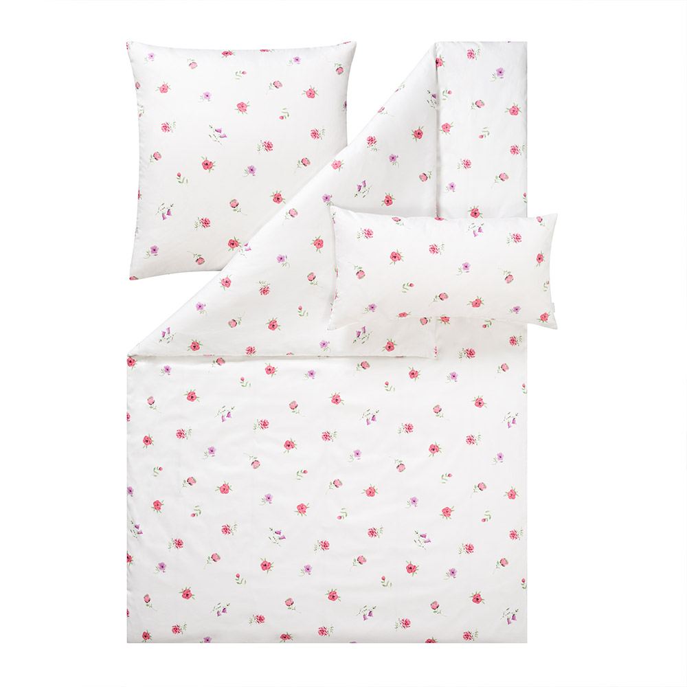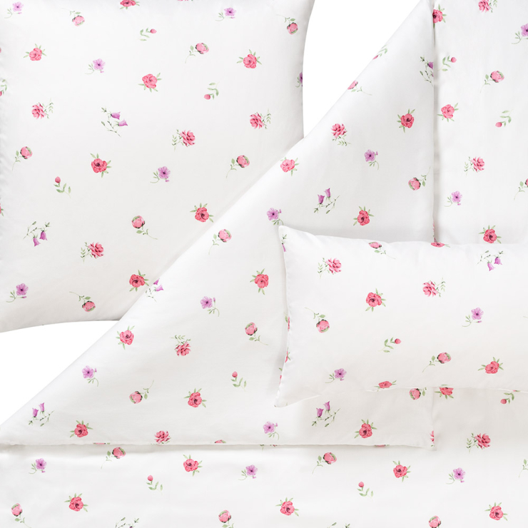 Die Mako-Satin-Bettwäsche Marion in der Farbe Kirsch bringt den Zauber einer blühenden Sommerwiese direkt in dein Schlafzimmer. Zarte Blüten in Rosa, Kirschrot und einem Hauch von Flieder tanzen auf elfenbeinfarbenem Hintergrund – ein liebevoll gestaltetes Design, das Frische, Leichtigkeit und natürliche Schönheit ausstrahlt.