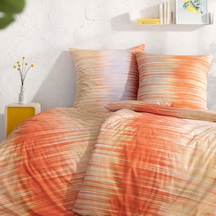 Ein Sonnenaufgang zum Einkuscheln: Die Kissen- und Bettdeckenbezüge der Garnitur Nestor bezaubern mit einem sanften Farbverlauf in warmen Orange- und Beigetönen. Die feine Streifenoptik erinnert an feine Lichtspiele am Morgenhimmel. Ideal für Räume, die eine behagliche und freundliche Atmosphäre ausstrahlen sollen. Mit Deko in Sand- oder Cremetönen harmoniert dieses Set besonders gut und lässt dein Bett geradezu strahlen.