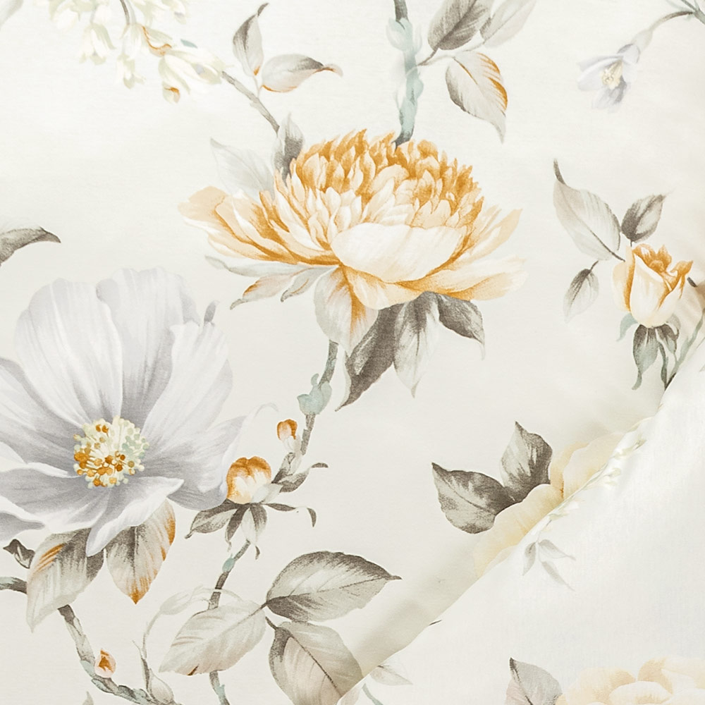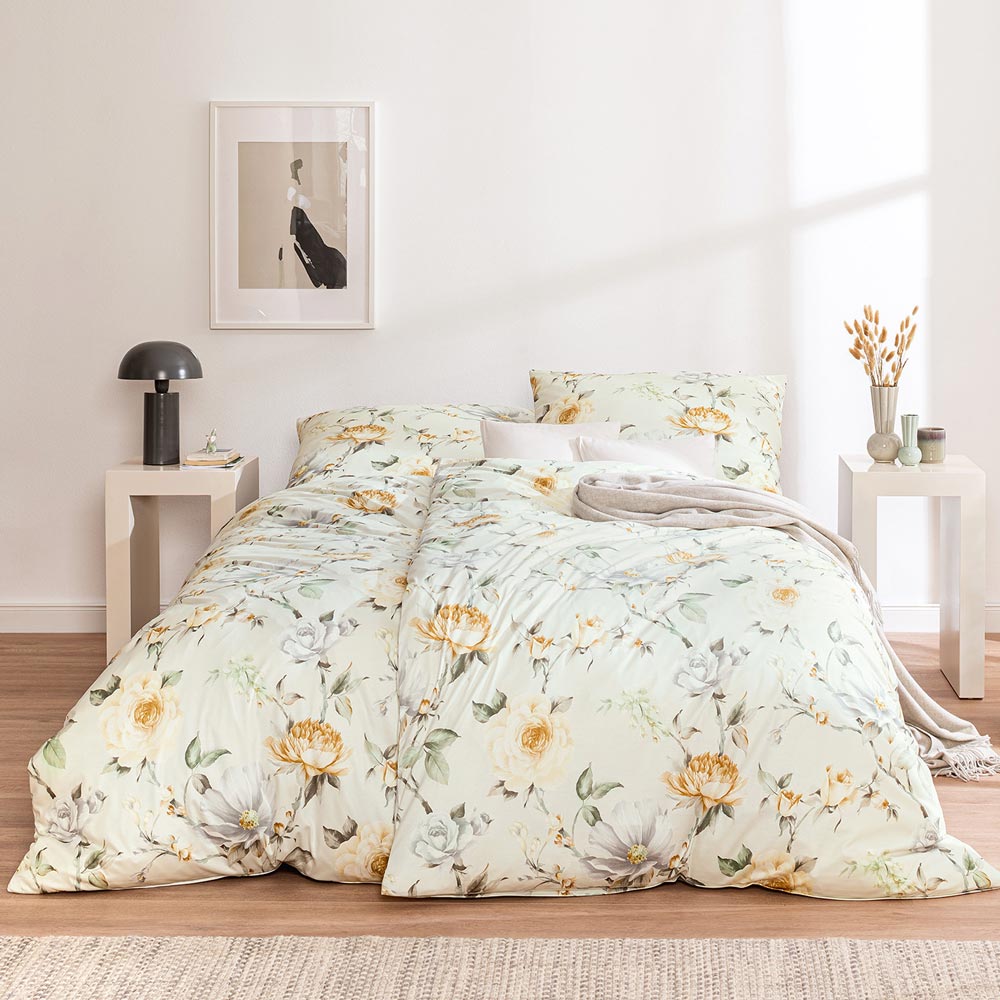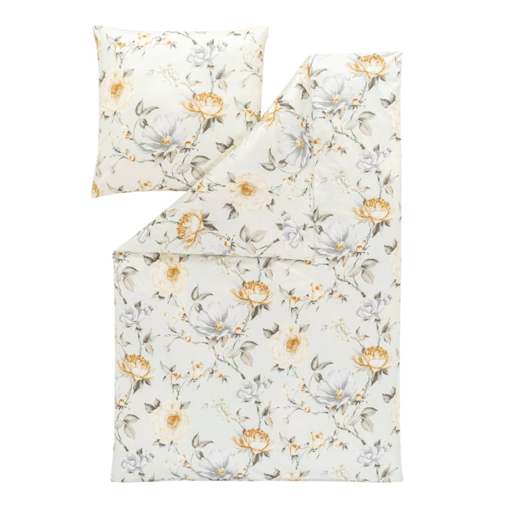 Die Bezüge der Bettwäsche Penelope sind ein extravaganter Hingucker für deine Schlaf- und Gästezimmer. Ihr Grundfarbton Ecure ist etwas dunkler als Weiß und besitzt einen leichten grün-bräunlichen Stich. Die goldgelben und silbergrauen Blüten des Rosendekors wirken der kühlen Optik dezent entgegen. So entsteht eine einzigartig edle Anmutung, die deinen Liebsten und gelegentlichen Schlafgästen sofort ins Auge fallen wird.