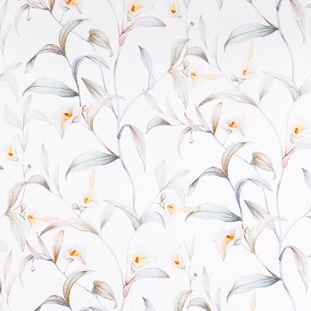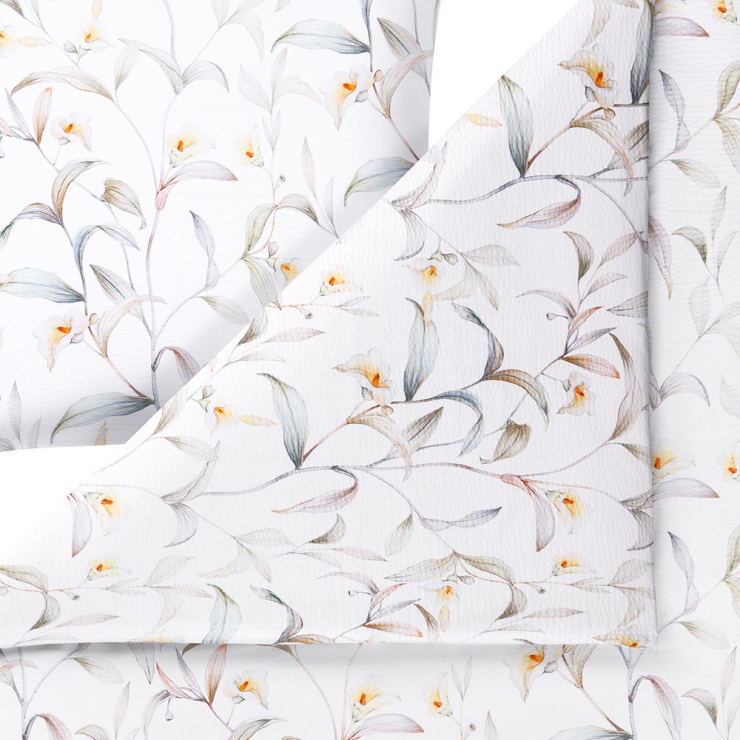 Ihr zartes Blätterdesign in sanften Grün-, Beige- und Graunuancen wirkt wie ein leichter Windhauch inmitten eines Sommergartens.
