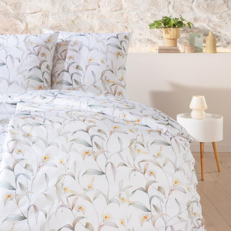 Die typische Seersucker-Struktur lässt die Luft optimal zirkulieren und sorgt für ein trockenes, ausgeglichenes Schlafklima.