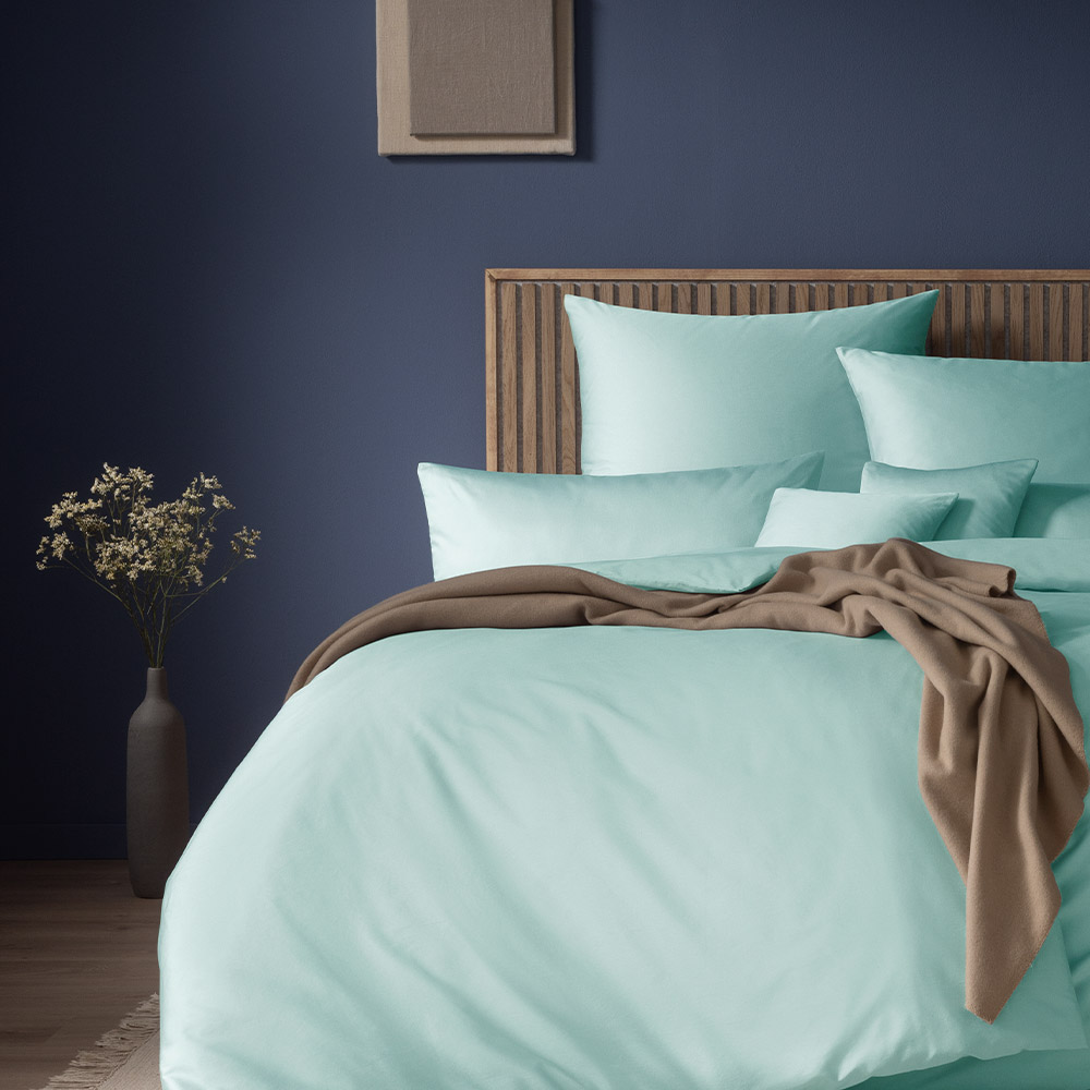 Die Mako-Satin-Bettwäsche Valetta in der Farbe Azur verleiht deinem Schlafzimmer ein Gefühl von Frische und Ruhe. Der klare, unifarbene Look in elegantem Azur setzt stilvolle Akzente und fügt sich perfekt in moderne, skandinavische oder minimalistische Wohnkonzepte ein – zeitlos schön und herrlich unkompliziert.