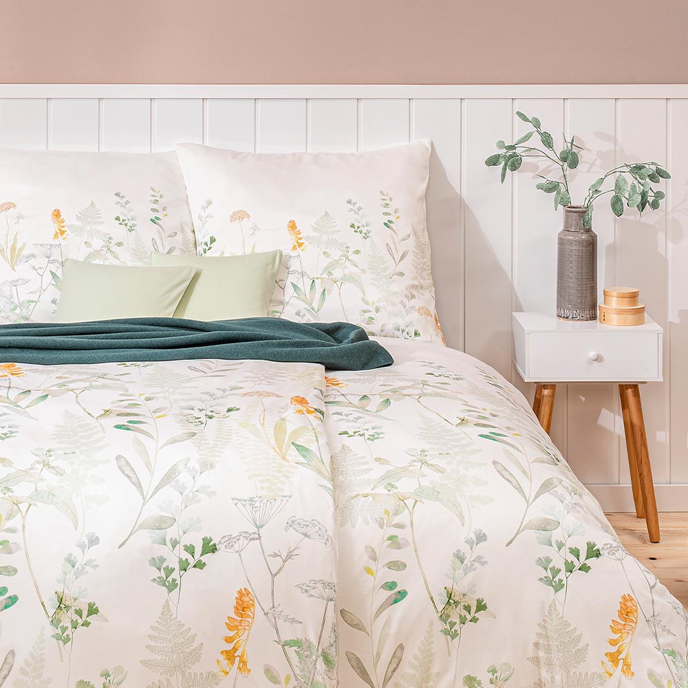 Für die Mako-Interlock-Jersey-Bettwäsche Visby empfehlen wir die Spannbetttuchfarbe 565-verde oder 705-quitte.