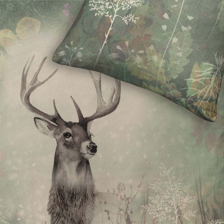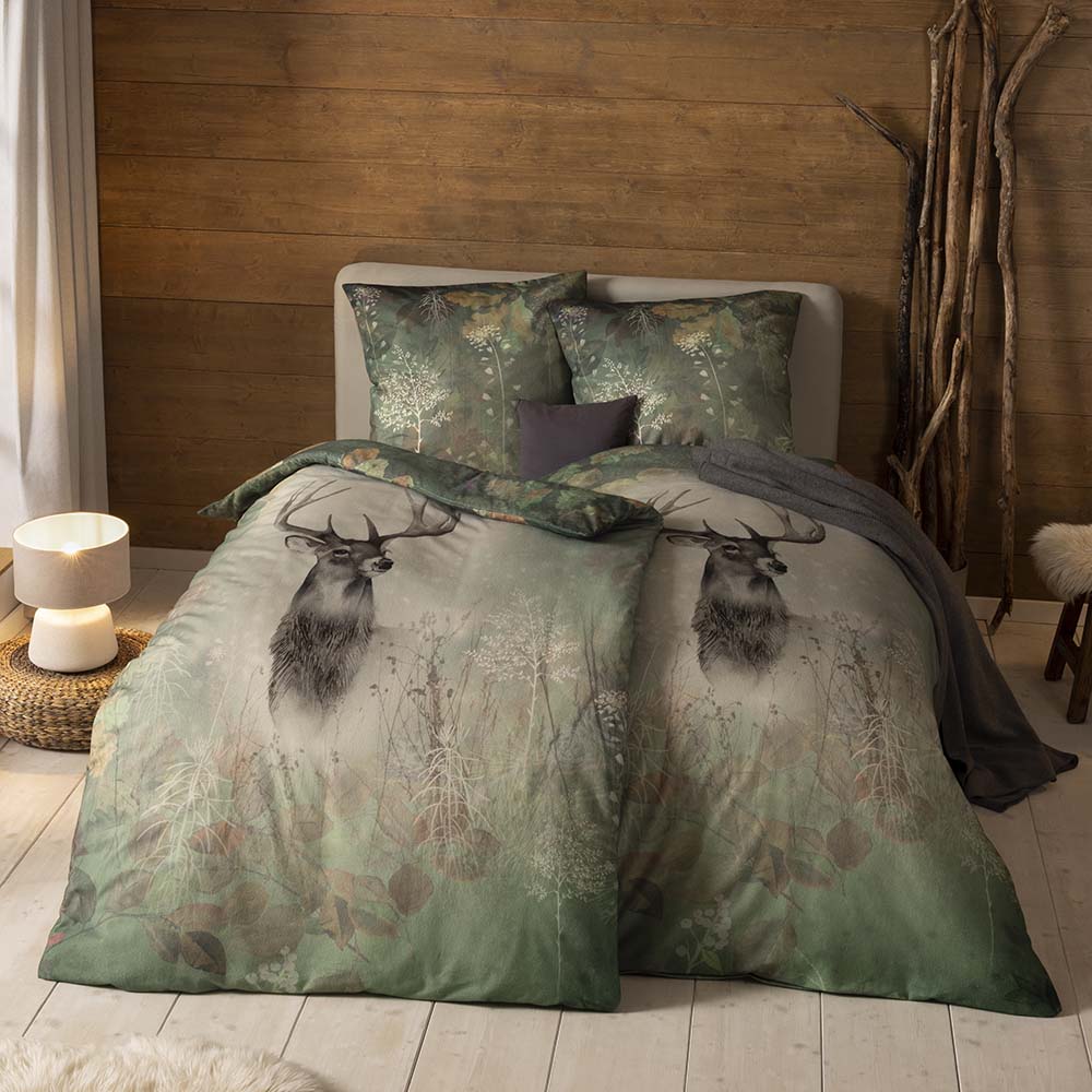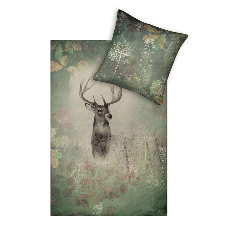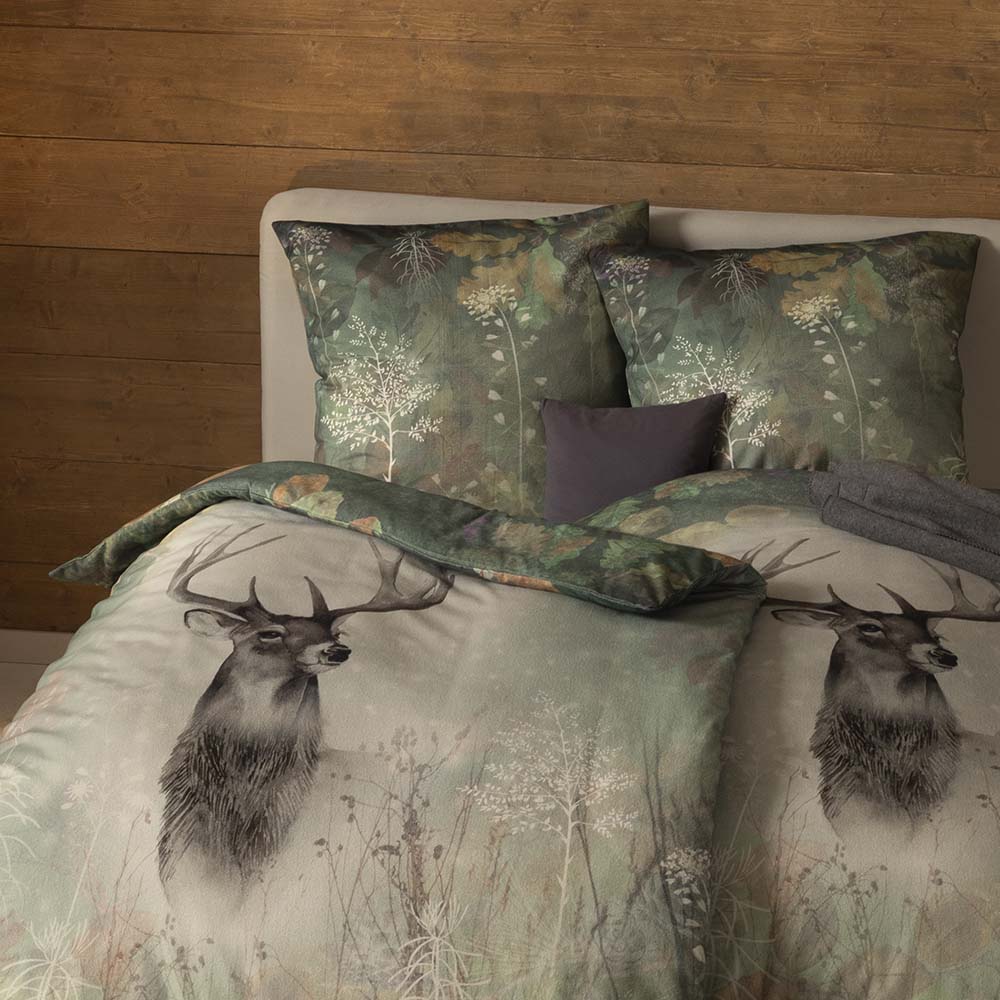Die Bezüge der Bettwäsche Wilbur verleihen deinem Schlafzimmer den Charme verträumter Wälder. Ihr moosgrüner Grundfarbton und das stilvolle Waldmotiv mit den weißen und braunen Akzenten schaffen eine naturverbundene Basis. Der Fokus des Designs liegt auf einem majestätischen Hirsch, der aufrecht und stolz über deine Nachtruhe wacht. Möchtest du ihm ein neues Zuhause geben?