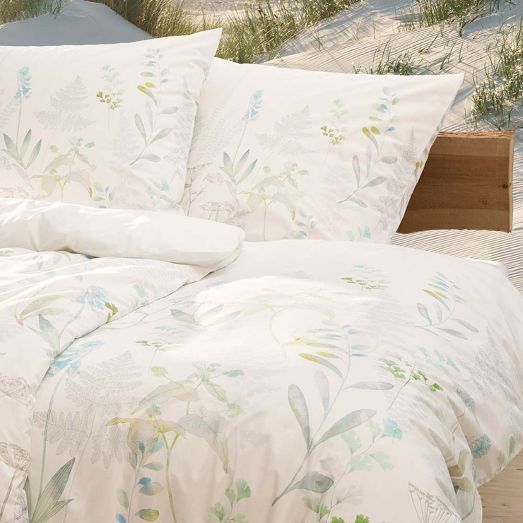 Wie vorsichtig und sanft sich der feine Aufdruck aus den Maschen der Bettwäsche Visby erhebt. Wie natürlich die Anmutung der einzelnen Gräser, Blätter und Blüten doch ist. Wie erfrischend das anmutige Dekor dank des Einsatzes von viel Weißraum wirkt. Keine Frage: Mit einer derart hellen und freundlichen Optik verschönern diese Bezüge ein jedes Schlafzimmer mit Bravour.