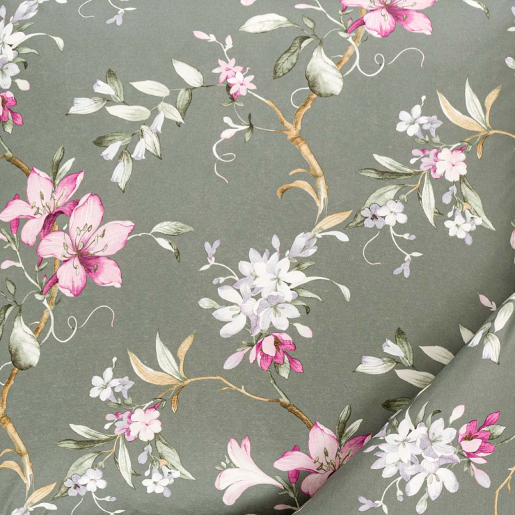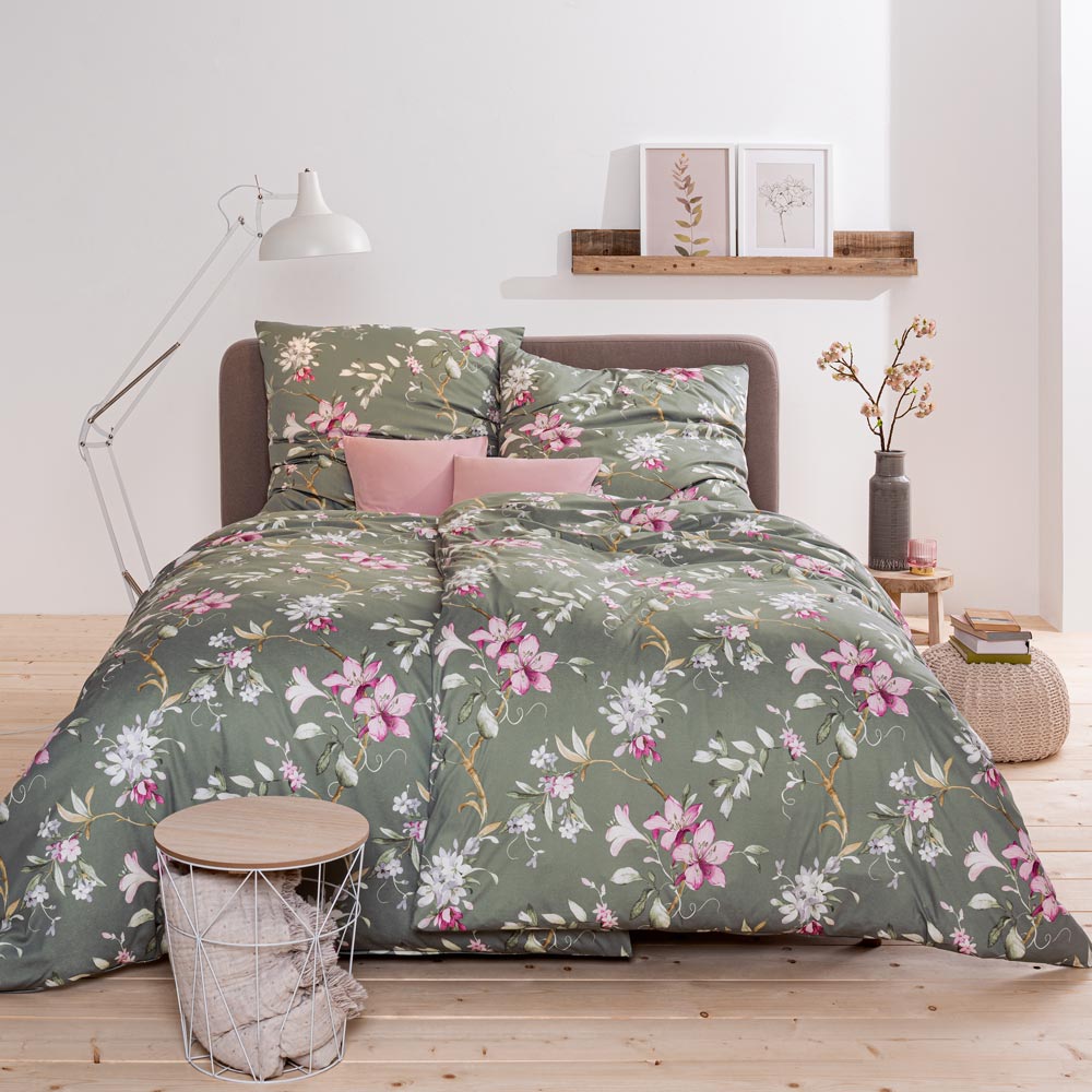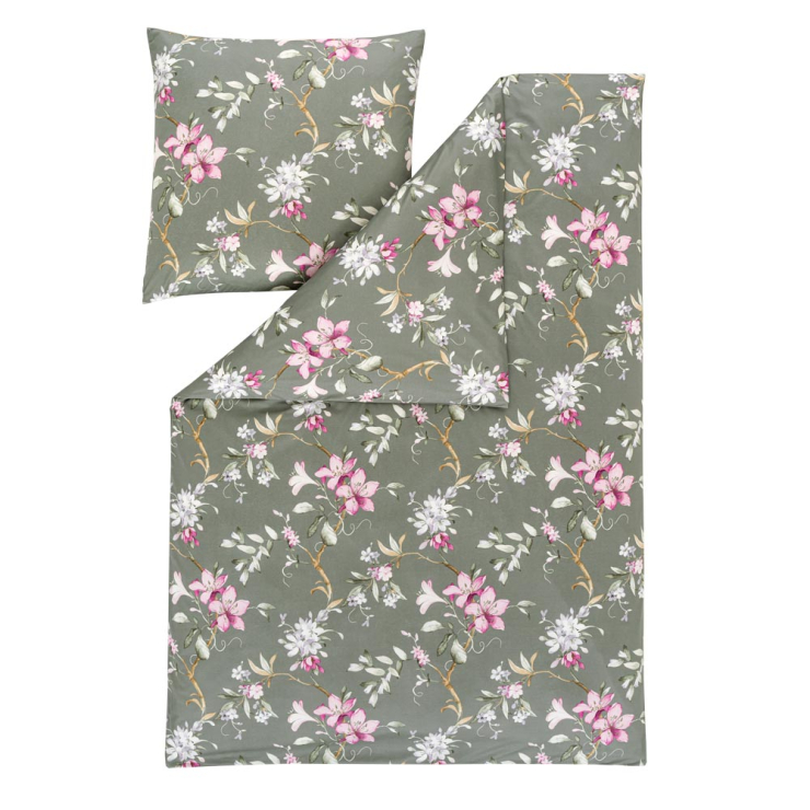 Diese dunkle Schönheit unter den Bettwäschegarnituren sticht durch ihren olivfarbenen Grundfarbton hervor. Die außergewöhnliche Nuance harmoniert hervorragend mit den weißen und pinken Blüten, die sich als wunderschönes Dekor auf dem Stoff niederlassen. Doch nicht nur die Optik – auch die Haptik Lilianas lädt zum Einkuscheln und Liegenbleiben ein. Kaum zu glauben? Testen Sie es selbst!