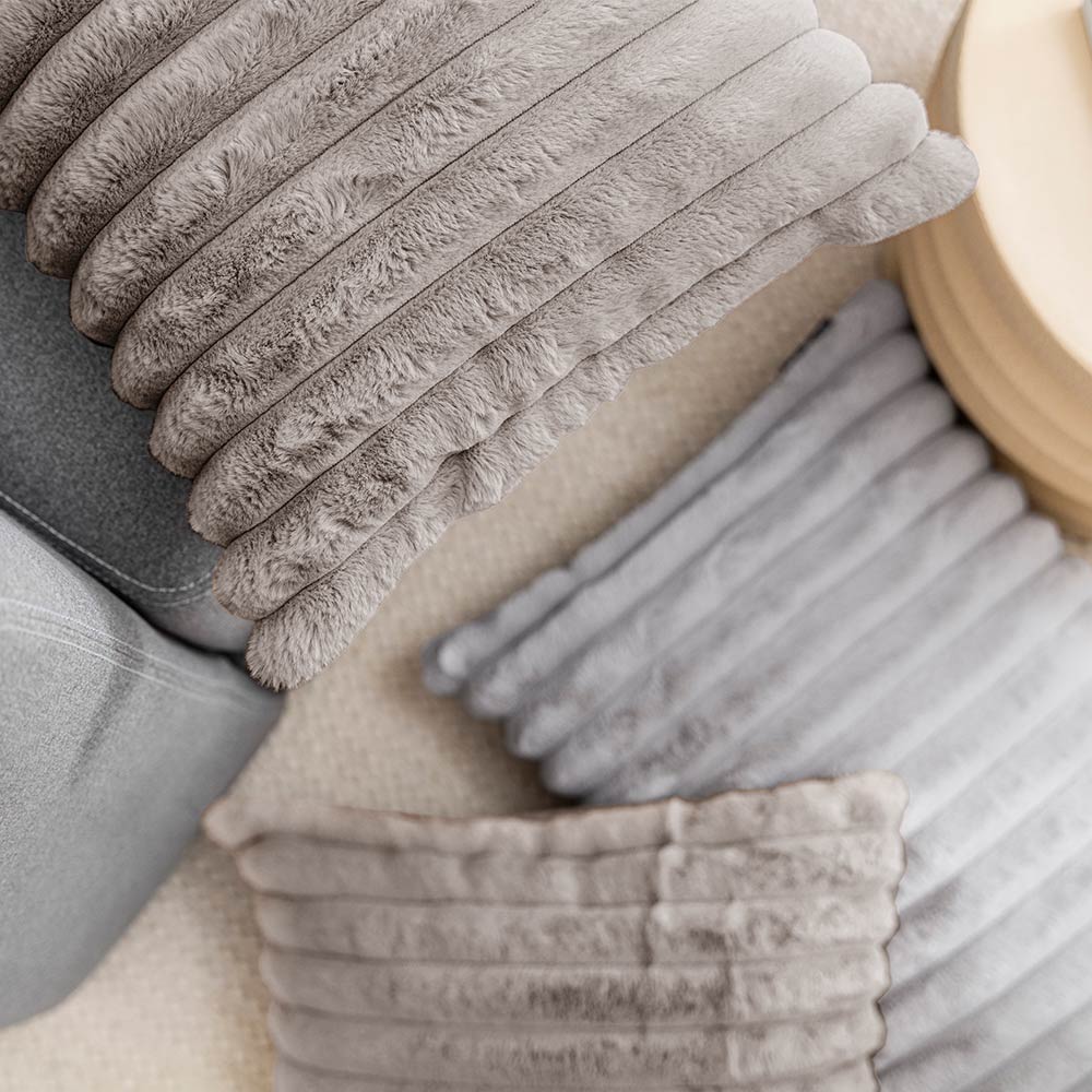 Die Vorderseite greift die charakteristische Struktur des passenden Plaids auf und sorgt für eine dezente, hochwertige Optik. Auf der Rückseite zeigt sich der Dekokissenbezug in einer unifarbenen, flauschigen Oberfläche, die zusätzlichen Komfort bietet und das Gesamtbild harmonisch abrundet.