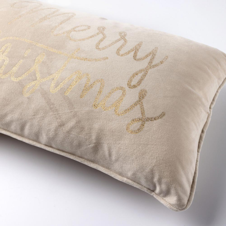 Die goldene Stickerei mit dem Schriftzug "Merry Christmas" verleiht dem Kissen eine festliche Note und setzt einen strahlenden Akzent.